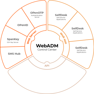 WebADM provides a hierarchical view of your LDAP organization, centralized audit and powerful applications’ management features. It is able to aggregate multiple heterogeneous LDAP directories in a single view. It supports delegated administration, fine-grained access-control to LDAP data and role-based permissions for all management operations. As a framework, it is the container that provides integration to RCDevs’ Web Services (OpenOTP, SMSHub, TiQR…) and end-user WebApps (User Self Service Desk, Self Token Registration, OpenID & SAML IdP…)