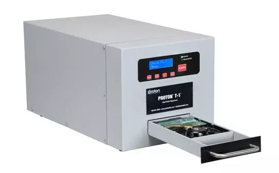 The Proton T-1 is a drawer style degausser that destroys data on hard drives and other magnetic media to help organizations protect sensitive information and stay in compliance with various Government regulations for data sanitization. The T-1 is automatic, light weight and simple to use so it will fit easily into existing operations.