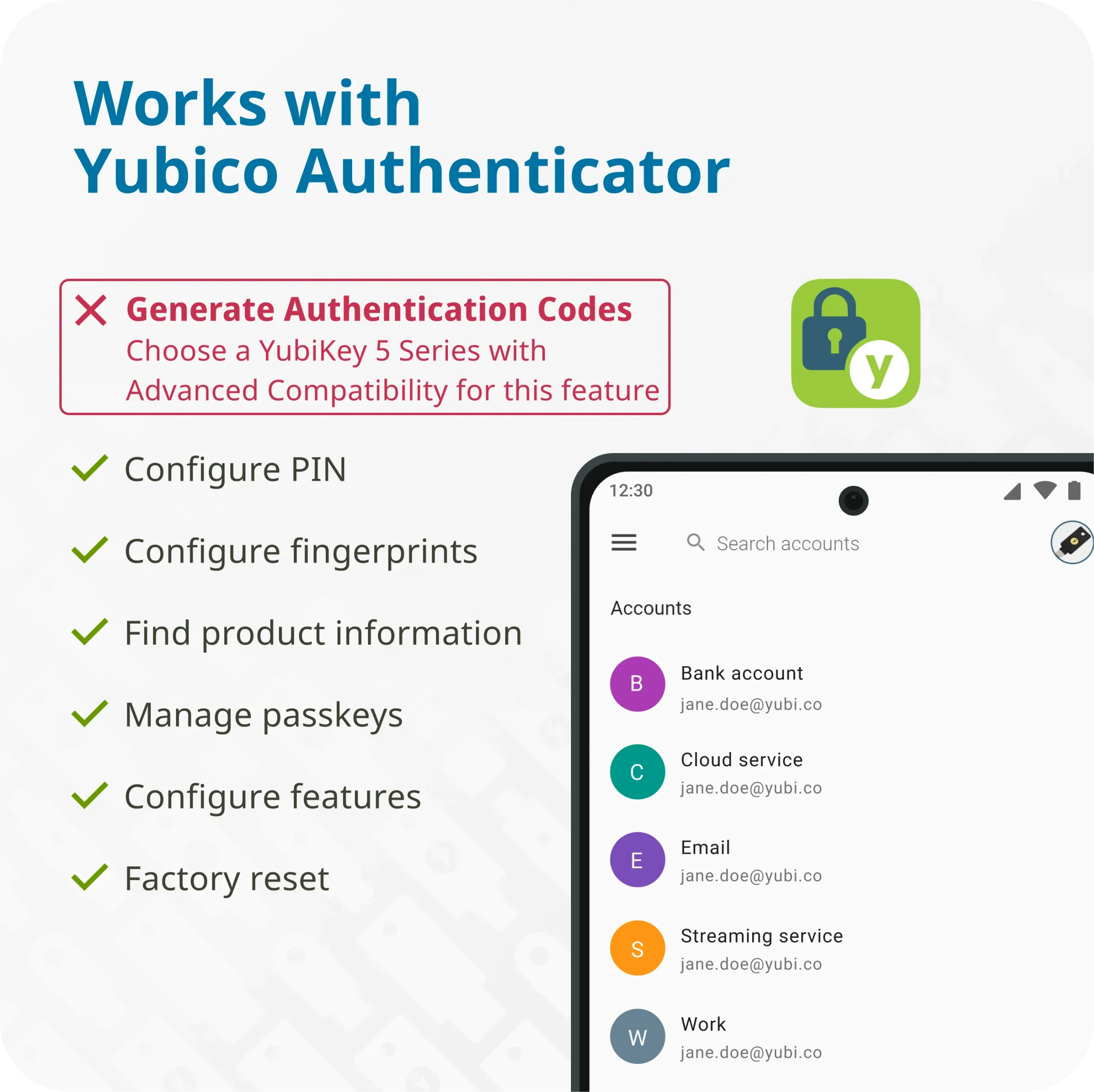 Yubico Authenticator App – Manage passkeys, FIDO2 PIN, FIDO2 biometrics on desktop version – Upgrade to the YubiKey 5 Series for use of OATH and PIV credentials with the Yubico Authenticator App.