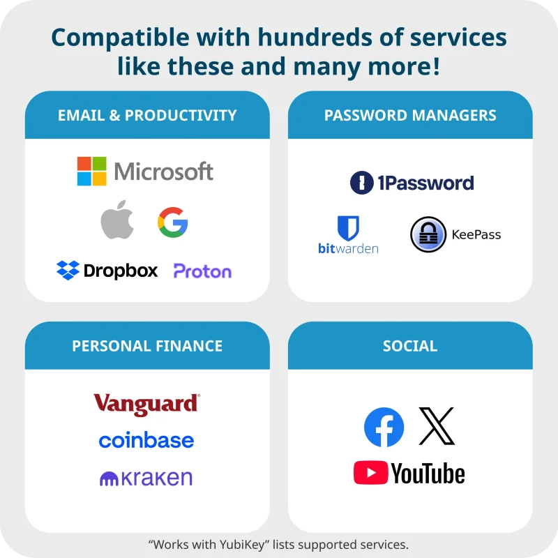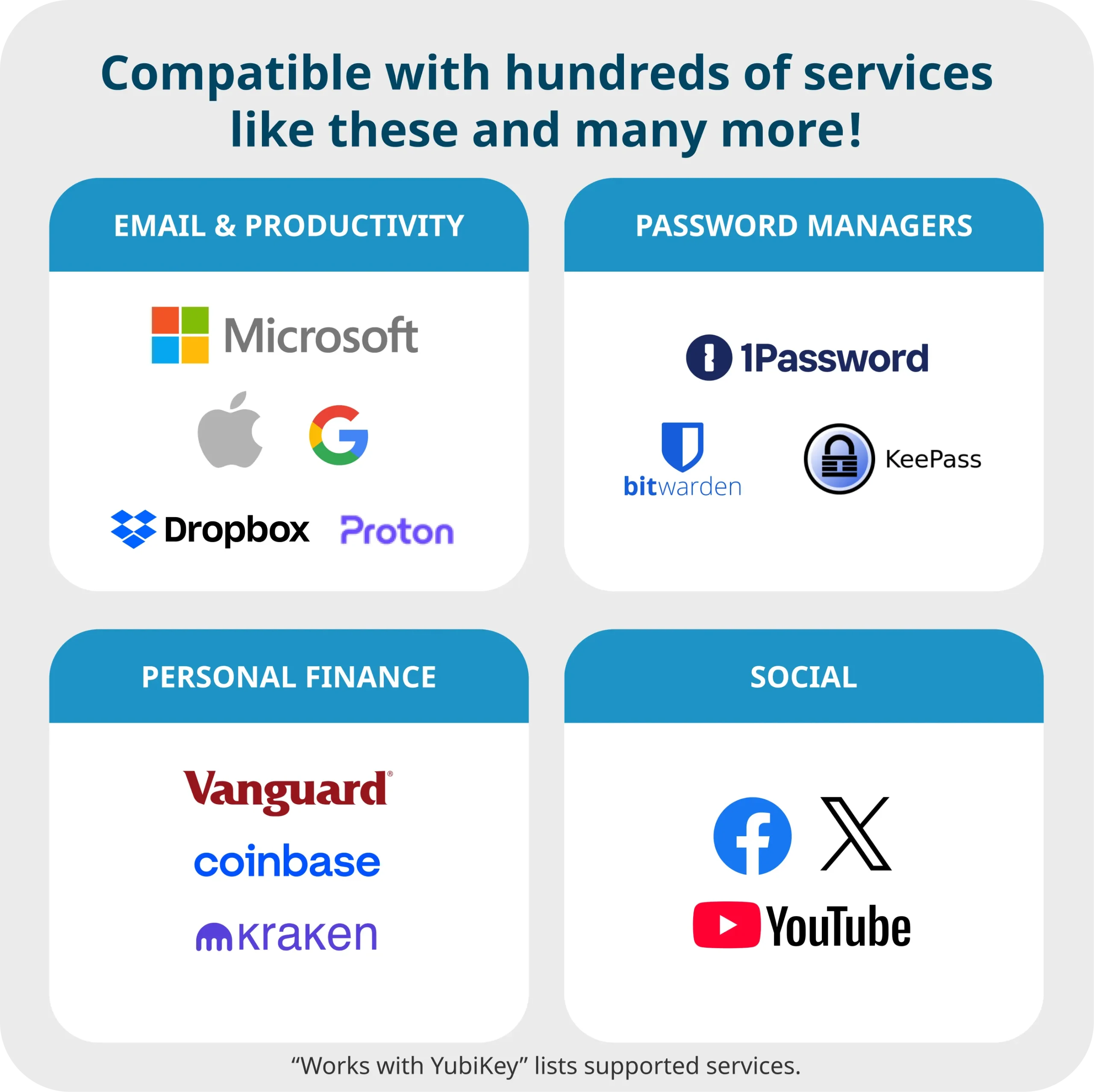 - Versatile compatibility: Supported by Google and Microsoft accounts, Identity Access Managers, password managers and hundreds of other popular services. It works with operating systems and browsers including Windows, macOS, Chrome OS, Linux, Chrome, and Edge. See our “Works With YubiKey” catalog for additional compatible services. The YubiKey Bio Series is built primarily for desktops.