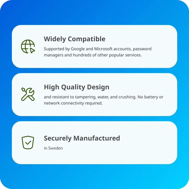 - Durable and reliable: High quality design and resistant to tampering, water, and crushing. No batteries or network connectivity required, offering dependable authentication without any downtime. Securely manufactured in Sweden.